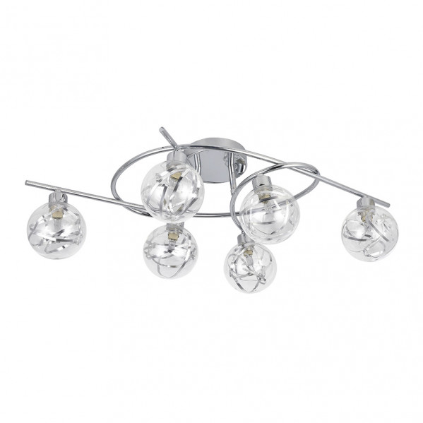 Plafón de seis luces serie VARANASI, realizada en metal color CROMO y tulipas de cristal y metal. Diseño moderno y muy original, resaltando además de su forma, sus tulipas, en las que el cristal deja ver un entresijo de cintas de metal en su interior, resultando una composición muy especial para decorar tanto en salones como en dormitorios con un toque muy personal. Tiene unas dimensiones de 21x65x30 centímetros. Posee seis porta lámparas en G9. Bombillas no incluidas. Puede completar la decoración de su hogar con las lámparas de cuatro y seis luces, el plafón de cuatro luces y el sobremesa. Todos los modelos también en color cuero.