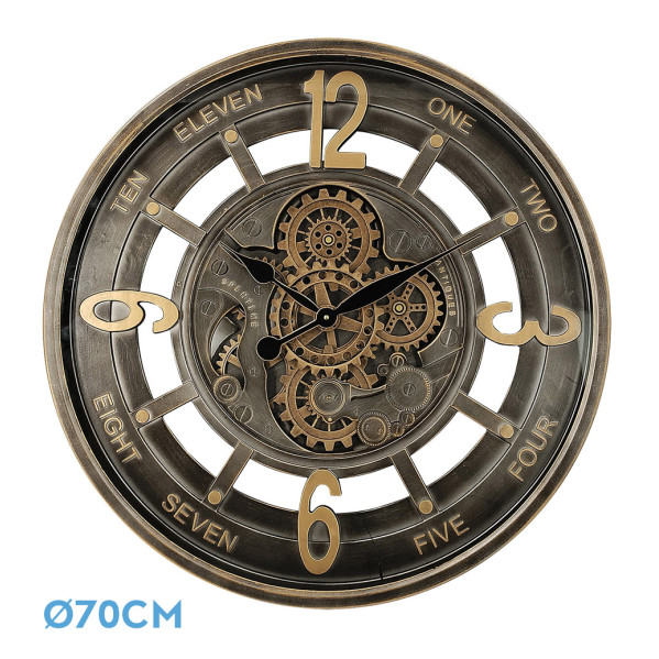 Reloj de Pared de la serie PADUA en color ORO/CUERO. Realizado en metal y cristal. Presenta un diseño clásico, imitando a los relojes antiguos pero también muy acorde con decoraciones modernas, Vintage o Industrial. Sus números y detalles calados en color oro, sus agujas de diseño y sus engranajes con movimiento que están a la vista, hacen que resulte una composición muy decorativa y vistosa. Tecnología de Cuarzo y funcionamiento silencioso, sus agujas tienen movimiento continuo. Funciona con 3 pilas alcalinas AA, pilas no incluidas. Tiene unas dimensiones de 70x70x8 centímetros.