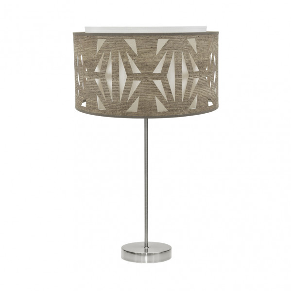 Sobremesa ALTO serie KATERINA en color NIQUEL/MADERA GRIS. Realizado en metal y textil, se caracteriza por el diseño moderno del dibujo que crea su pantalla calada, resultando una bonita composición para decorar e iluminar cualquier estancia del hogar o lugar de trabajo. Posee un portalámparas E27. Bombilla no incluida. Tiene una dimensión de 61x30x30 centímetros. En esta misma serie podemos encontrar los colgantes de 60, 50, 40 y 30 centímetros de diámetro, un pie de salón y dos modelos de sobremesa. Todos también disponible en las combinaciones de colores madera clara, madera oscura, madera gris y madera negra.