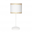 Sobremesa serie CENEFA de color blanco con detalles en naranja. La pantalla es de 17 cm de diámetro con dos cenefas decorativas en tonos naranjas, verdes y azules. El portalámparas es E14.