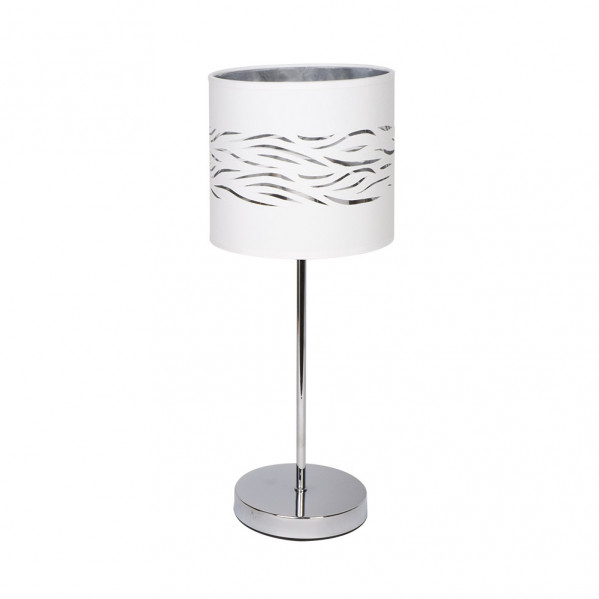 Sobremesa serie NIEBLA en color CROMO con pantalla en BLANCO/PLATA. Realizado en metal y textil, se caracteriza por el diseño moderno del dibujo que crea su pantalla calada, dejándose ver el color plata de su interior, resultando una bonita composición para decorar e iluminar cualquier rincón del hogar o lugar de trabajo. Posee un portalámparas E14. Bombilla no incluida. Tiene una dimensión de 43x17x17 centímetros. En esta misma serie podemos encontrar los colgante de 40 y de 50 centímetros de diámetro. Todos también disponible en las combinaciones de colores cromo/marrón-plata, blanco/blanco-oro y marrón/marrón-oro.