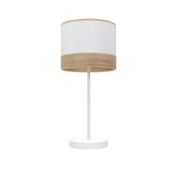 Sobremesa de la serie OLGA de color BLANCO con pantalla confeccionada en colores BLANCO/MADERA CLARA. Realizado en textil y metal. Posee un portalámparas E14. Bombilla no incluida. El original diseño de sus pantallas, combinando el blanco con colores madera clara o madera negra, hace que esta serie pueda combinarse con distintos estilos de decoración, desde el moderno al rústico, muy acorde también con decoraciones naturales o minimalistas. Aportan calidez a comedores, dormitorios, salones y centros de trabajo. Tiene unas dimensiones de 42x18x18 centímetros. Se puede completar con toda una serie de artículos a juego, como colgantes, plafones, sobremesas, apliques y pies de salón, para cubrir todas las necesidades de iluminación que requiera su hogar o centro de trabajo.
