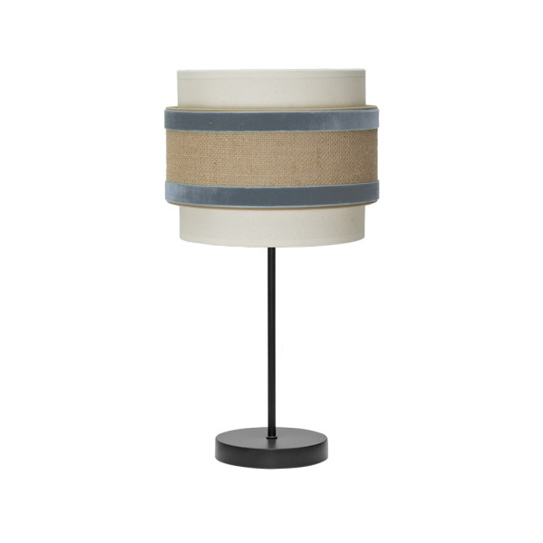 Sobremesa pequeño de la serie CORNALINA con pantalla de color BEIS/AZUL combinando con tejido de saco de 18 centímetros de diámetro. Posee un portalámparas E14. Bombilla no incluida. Pantalla formada por tres cuerpos en textil, uno de ellos con tela de saco y ribeteada en terciopelo de color azul, que junto con su montura en color negro resulta una composición muy bonita y original. De estilo moderno y diseño elegante, ideal para decorar e iluminar en dormitorios, salones y salas de estar, aportando calidez a la estancia que ilumina. Sus dimensiones son de 47x18x18 centímetros. En esta serie podemos encontrar los colgantes de 50, 40 y 30 centímetros de diámetro, dos tamaños diferentes de sobremesas, el aplique y el pie de salón, todos combinando tejido de saco con textil y terciopelo en colores beis/negro, beis/azul y beis/verde.