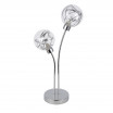 Sobremesa de dos luces serie VARANASI, realizada en metal color CROMO y tulipas de cristal y metal. Diseño moderno y muy original, resaltando además de su forma sus tulipas, en las que el cristal transparente deja ver un entresijo de cintas de metal en su interior, resultando una composición muy especial para decorar cualquier rincón tanto en salones como en dormitorios con un toque muy personal. Tiene una dimensión de 46x27x13 centímetros y un peso neto 700 gramos. Posee dos porta lámparas en G9. Bombillas no incluidas. Puede completar la decoración de su hogar con las lámparas de cuatro y seis luces y los plafones de cuatro y seis luces. Todos los modelos también en color cuero.