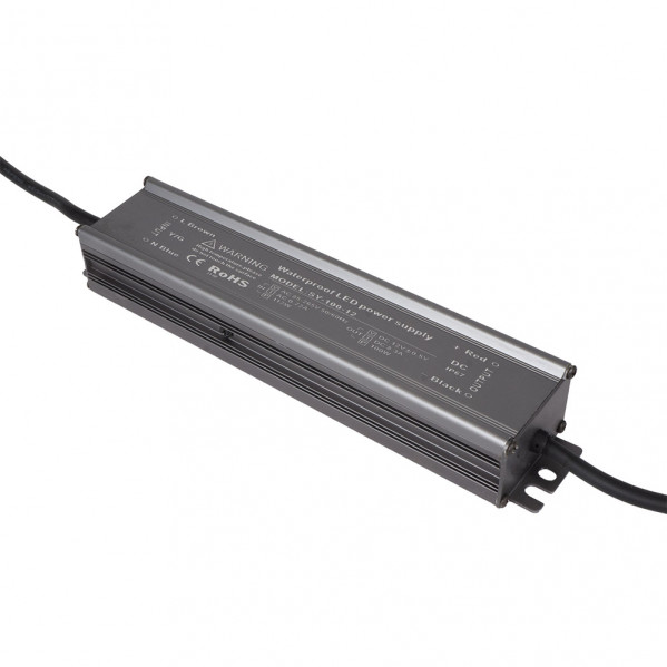 Transformador ESTANCO de cintas de led FREYA de 100 watios a 12V en color GRAFITO. Tiene unas medidas de 3×4,5×21 centímetros y un peso neto de 425 gramos. Es resistente al agua con un índice de protección IP68.