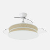 Exclusivo y original ventilador DC de la serie DECOR con tres aspas DESPLEGABLES de ABS, en color BLANCO con difusor combinado en texturas y colores NATURAL/BLANCO. Realizado en metal, ABS, textil y policarbonato. Diseño muy moderno y versátil, el diseño de su difusor hace que este ventilador tanto en funcionamiento como en sólo modo lámpara, se haga el centro de la habitación que decore. Motor DC con seis velocidades ajustables. Tecnología LED integrada con una potencia de 72W, 7200 lúmenes y con 3 TEMPERATURAS SELECCIONABLES DE LUZ (3000-4000-6000K). Control de aire verano o invierno. Su medida es de 39/54X49X49 centímetros con las aspas plegadas y de 39/54X108X108 centímetros con las aspas desplegadas, con dos medidas de tija para instalarlo a diferentes alturas. Mando a distancia INCLUIDO con MEMORIA DE COLOR incorporada y TEMPORIZADOR 1/2/4 H. Modelo disponible tanto en negro como en blanco y con varios diseños diferentes en sus difusores.