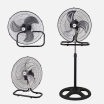 Ventilador 3 en 1 de la serie RECIO realizado en metal y policarbonato de color NEGRO con tres fuertes aspas de aluminio en color PLATA. Adaptable a ventilador tanto de suelo, de pie como de pared. Con cabezal oscilante y multi orientable y tres velocidades. Motor AC. Con dos funciones de movimiento, fijo y rotatorio. Tiene una potencia de 70 watios , una medida como ventilador de pie, regulable en altura, de 100<,130x50x50 centímetros.