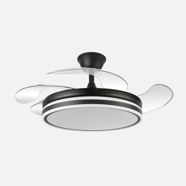 Ventilador BAYOMO realizado en metal y policarbonato, en color NEGRO con cuatro aspas DESPLEGABLES de ABS transparente muy resistentes. Motor DC. Tiene seis velocidades ajustables. Tecnología LED integrada con una potencia de 59W, con 3 TEMPERATURAS DE LUZ (3000-4000-6000K) y 6980 lúmenes. Control de aire verano o invierno. Su medida es de 34,5/42X50X50 centímetros con las aspas plegadas y de 34,5/42X107X107 centímetros con las aspas desplegadas, con dos medidas de tija para instalarlo a diferentes alturas. Mando a distancia INCLUIDO, REGULABLE EN INTENSIDAD, con MEMORIA DE COLOR incorporada y TEMPORIZADOR 2/4 H. Modelo disponible en color Níquel, Cuero, Blanco y en color Negro.