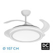 Ventilador DC de la serie BANDIDO realizado en metal, ABS y policarbonato en color BLANCO con cuatro aspas DESPLEGABLES transparente muy resistentes. Tiene seis velocidades ajustables. Tecnología LED integrada con una potencia de 59W, con 3 TEMPERATURAS SELECCIONABLES DE LUZ (3500-4000-6500K) y 5900 lúmenes. Control de aire verano o invierno. Su medida es de 35,5/45,5X48 centímetros con las aspas plegadas y de 35,5/45,5X107 centímetros con las aspas desplegadas. Incluye dos tijas de 10 y 20 centímetros, para colocar a distintas alturas. Mando a distancia INCLUIDO y TEMPORIZADOR 1/2/4 H.