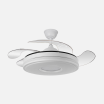Ventilador DC serie DANI realizado en metal, policarbonato, en color BLANCO con cuatro aspas DESPLEGABLES de ABS transparente muy resistentes. Tiene seis velocidades ajustables. Motor DC. Tecnología LED integrada con una potencia de 59W, con 3 TEMPERATURAS SELECCIONABLES DE LUZ (3000-4200-6500K) luz cálida, natural y blanco frío, y 6980 lúmenes. Control de aire verano o invierno. Su medida es de 34/41,5X50 centímetros con las aspas plegadas y de 34/41,5X106 centímetros con las aspas desplegadas. Incluye dos tijas de 12,5 y 20 centímetros, para instalar a distintas alturas. Mando a distancia INCLUIDO, REGULABLE EN INTENSIDAD, con MEMORIA DE COLOR incorporada y TEMPORIZADOR 2/4 H. Modelo disponible en color cuero, blanco, negro y níquel, además de en dos tamaños diferentes.