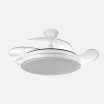 Ventilador DC de la serie ESCORPION realizado en metal, policarbonato y ABS, en color BLANCO con cuatro aspas DESPLEGABLES de ABS transparente muy resistentes. De diseño innovador, ideal para completar tanto en decoraciones modernas como clásicas, realizando tanto la función de lámpara como de ventilador. Motor DC con seis velocidades ajustables. Tecnología LED integrada con una potencia de 59W, 6980 lúmenes y 3 TEMPERATURAS SELECCIONABLES DE LUZ (3000-4000-6000K) luz cálida, natural y blanco frío. Control de aire verano o invierno. Su medida es de 34,5/42X50 centímetros con las aspas plegadas y de 34,5/42X107 centímetros con las aspas desplegadas. Incluye dos tijas de 12,5 y 20 centímetros, para colocar a distintas alturas. Mando a distancia INCLUIDO, REGULABLE EN INTENSIDAD, con MEMORIA DE COLOR incorporada y TEMPORIZADOR 2/4 H.