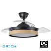 Ventilador DC de la serie IGLU realizado en metal, policarbonato y ABS, en color NEGRO/HAYA con tres aspas DESPLEGABLES de ABS transparente muy resistentes. Tiene seis velocidades ajustables. Tecnología LED integrada con una potencia de 72W, con 3 TEMPERATURAS SELECCIONABLES DE LUZ (3000-4000-6000K) y 6120 lúmenes. Control de aire verano o invierno. Su medida es de 32/47X40 centímetros con las aspas plegadas y de 32/47X91 centímetros con las aspas desplegadas. Incluye dos tijas de 10 y 25 centímetros, para colocar a distintas alturas. Mando a distancia INCLUIDO con MEMORIA DE COLOR incorporada y TEMPORIZADOR 1/4 H. Modelo disponible en color negro/haya y blanco/haya, tanto en una medida de 107 como de 91 centímetros de diámetro.