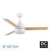Ventilador DC de la serie LEGIO de color BLANCO con 3 aspas reversibles en color BLANCO/HAYA. Realizado de metal, MDF y policarbonato. Diseño con líneas rectas, elegante y moderno. Posee Tecnología LED Integrada con una potencia de 26 watios, 2950 lúmenes y con COLOR DE LUZ SELECCIONABLE EN 3 TEMPERATURAS (3000-4000-6000K) luz cálida, natural y blanco frío. Tiene unas dimensiones de 42,5/52,5x107x107 centímetros con dos medidas de tija incluidas para instalar a distintas alturas. Contiene MANDO A DISTANCIA con MEMORIA DE COLOR, modo de verano/invierno y TEMPORIZADOR de 1 hasta 8 horas. Modelo disponible en color blanco-blanco/haya, negro-negro/roble y níquel-plata/haya, hasta agotar existencias.