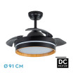 Ventilador DC de la serie NALON en color NEGRO/MADERA OSCURA con tres aspas DESPLEGABLES muy resistentes. Realizado en metal, ABS y policarbonato. De diseño muy moderno y elegante, actualizando el modo de iluminar y ventilar cualquier estancia. Tiene seis velocidades ajustables. Motor DC. Tecnología LED integrada con una potencia de 48W, 4800 lúmenes y 3 TEMPERATURAS SELECCIONABLES DE LUZ (3000-4500-6000K), luz cálida, blanco natural y blanco frío. Control de aire verano o invierno. Tiene unas dimensiones de 40/50x40x40 centímetros con las aspas plegadas y de 40/50x91x91 centímetros con las aspas desplegadas, con DOS MEDIDAS DE TIJA incluidas para colocar a distintas alturas. Mando a distancia INCLUIDO con MEMORIA DE COLOR incorporada y TEMPORIZADOR 1/2/4/8 H. Modelo disponible en dos tamaños y en color blanco, negro/oro, blanco/haya y negro/madera oscura.