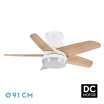 Ventilador de la serie NEUTRON realizado en metal, ABS y policarbonato, en color BLANCO con cinco aspas en color HAYA. Motor DC, seis velocidades. Tecnología LED incorporada con una potencia de 24W, 2400 lúmenes y 3 TEMPERATURAS SELECCIONABLES DE LUZ (3000-4500-6000K) luz cálida, natural y blanco frío. De diseño muy moderno y original, ideal para colocar en dormitorios, salas de estar y estudios inspirados en los nuevos estilos de decoración como el Industrial ó moderno. Tiene unas dimensiones de 32,5X91X91 centímetros. Control de aire verano o invierno. Mando a distancia INCLUIDO con MEMORIA DE COLOR incorporada y TEMPORIZADOR 1/2/4/8 H. Modelo disponible en color negro, blanco, cuero/negro, blanco/haya y plata