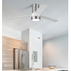 Ventilador DC serie TEO de color NÍQUEL con 3 aspas en color BLANCO. Realizado de metal, metacrilato y policarbonato. Tiene una medida de 32x139x139 centímetros. Tecnología LED integrada con una potencia de 24W, con 3 TEMPERATURAS SELECCIONABLES DE LUZ (3000-4000-6000K) y 2950 lúmenes. Contiene control remoto con 6 velocidades diferentes, memoria de color, modo de verano/invierno y temporizador de 1 hasta 8 horas. Modelo también disponible en color Níquel/Gris y en color Negro.