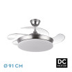 Ventilador DC de la serie TRIDENTE MINI realizado en metal, policarbonato y ABS, en color NIQUEL con cuatro aspas DESPLEGABLES de ABS transparente muy resistentes. De diseño innovador, ideal para completar tanto en decoraciones modernas como clásicas, realizando tanto la función de lámpara como de ventilador. Motor DC con seis velocidades ajustables. Tecnología LED integrada con una potencia de 59W, 6980 lúmenes y 3 TEMPERATURAS SELECCIONABLES DE LUZ (3000-4000-6000K) luz cálida, natural y blanco frío. Es REGULABLE EN INTENSIDAD, con mando a distancia INCLUIDO con MEMORIA DE COLOR incorporada y TEMPORIZADOR 2/4 H. Control de aire verano o invierno. Su medida es de 34,5/42X40 centímetros con las aspas plegadas y de 34,5/42X91 centímetros con las aspas desplegadas. Incluye dos tijas de 12,5 y 20 centímetros, para colocar a distintas alturas. Encontramos en esta serie dos tamaños de ventiladores y en los colores blanco, negro, níquel y cuero, para elegir el más le guste y el que mejor se adapte a su decoración.