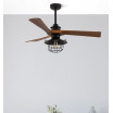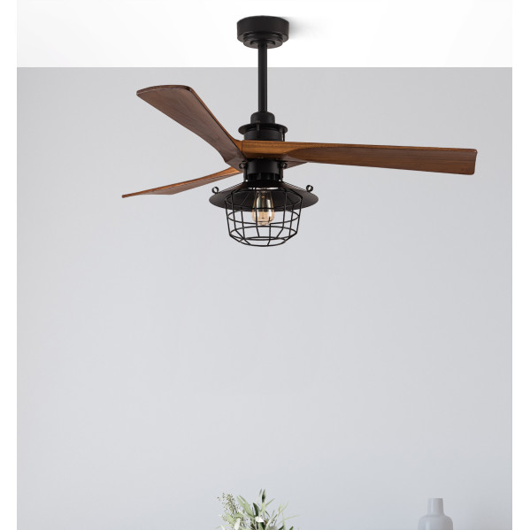 Ventilador VULTURNO realizado en metal y madera de color NEGRO con 3 aspas en ROBLE OSCURO y 6 velocidades. Motor DC. De diseño muy original, con una rejilla que protege su bombilla, lo hace idóneo para ambientes rústicos y decoraciones industriales. También viene con tapa incluida para funcionar como VENTILADOR CON LUZ O VENTILADOR SIN LUZ. Posee un portalámparas E27. Bombilla no incluida. Aconsejable completar con una bonita bombilla decorativa como la de las referencias 141301181 y 141301186 para preservar su estética. Tiene una medida de 53/65,5x132x132 centímetros, con DOS MEDIDAS DE TIJA (12,5 y 25 cm) para colocar a distintas alturas. Viene con mando a distancia INCLUIDO Y TEMPORIZADOR 1/2/4H.
