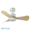Ventilador DC de la serie ZEPELIN de color BLANCO con 3 aspas en color HAYA. Realizado en metal, ABS y policarbonato. Con diseño muy moderno para combinar con los nuevos estilos de decoración. Tiene una medida de 35/50x91x91 centímetros. Motor DC. Tecnología LED integrada con una potencia de 18W, 1900 lúmenes y COLOR DE LUZ SELECCIONABLE EN 3 TEMPERATURAS (3000-4000-6500K) luz cálida, natural y blanco frío. Dispone de control remoto con 6 velocidades diferentes, memoria de color, modo de verano/invierno, temporizador de 1/2/4 horas, ideal para seleccionar por las noches y ganar una gran ahorro de energía. Incluye dos tijas de 10 y 25 centímetros para instalar en techos a distintas alturas. Modelo disponible en color negro/madera-clara, blanco/haya, cuero/roble y en color blanco.