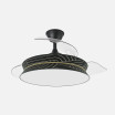 Exclusivo y original ventilador DC de la serie DECOR con tres aspas DESPLEGABLES de ABS, en color NEGRO con difusor combinado en texturas y colores NEGRO/PLATA. Realizado en metal, ABS, textil y policarbonato. Diseño muy moderno y versátil, el diseño de su difusor hace que este ventilador tanto en funcionamiento como en sólo modo lámpara, se haga el centro de la habitación que decore. Motor DC con seis velocidades ajustables. Tecnología LED integrada con una potencia de 72W, 7200 lúmenes y con 3 TEMPERATURAS SELECCIONABLES DE LUZ (3000-4000-6000K). Control de aire verano o invierno. Su medida es de 39/54X49X49 centímetros con las aspas plegadas y de 39/54X108X108 centímetros con las aspas desplegadas, con dos medidas de tija para instalarlo a diferentes alturas. Mando a distancia INCLUIDO con MEMORIA DE COLOR incorporada y TEMPORIZADOR 1/2/4 H. Modelo disponible tanto en negro como en blanco y con varios diseños diferentes en sus difusores.