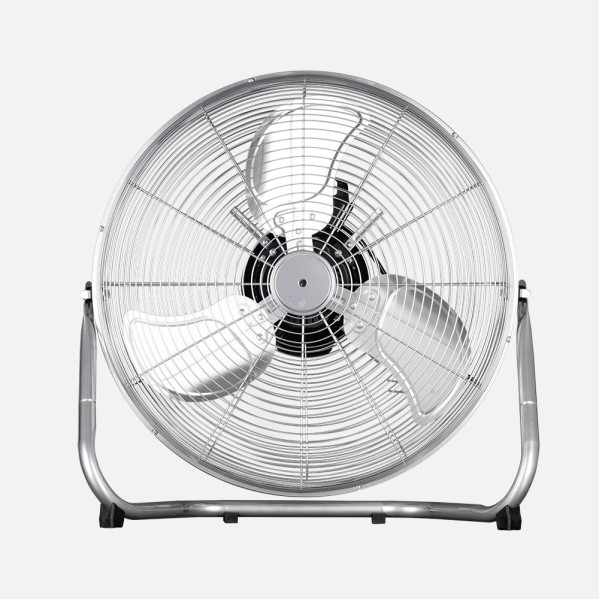 Ventilador industrial de la serie YUMBO realizado en metal y aluminio en color CROMO, con tres aspas y tres velocidades. Tiene una potencia de 110 vatios y una medida de 60X63X19,5 centímetros. Disponible en esta serie el ventilador Yumbo de 50, 80, 100 y 120 vatios.